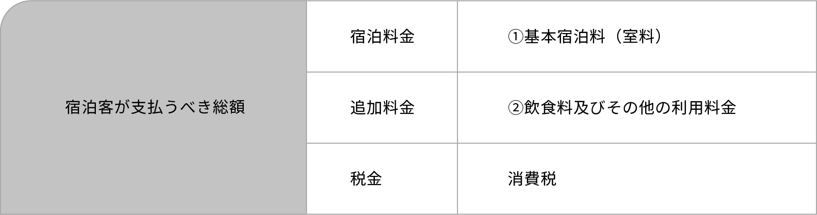 第10条 宿泊客が支払うべき宿泊料金等の内訳は、別表第一に掲げるところによります。